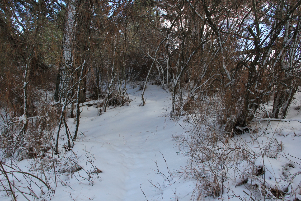 Into the canopy understory, composed mainly snowberry, with black-hawthorn.