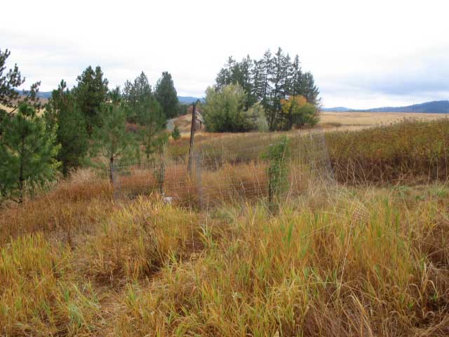 The field edge. Two wire exclosures, one with a nectarine the other with a cherry tree.