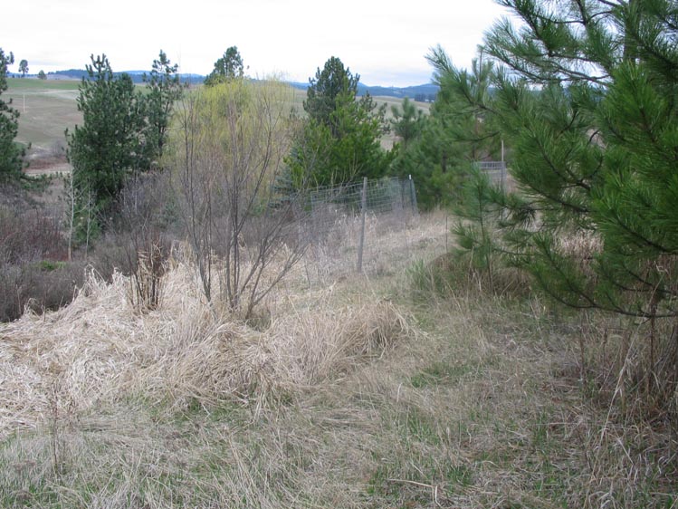 Still beside the field heading north. Wire cages to protect my fruit trees from deer.