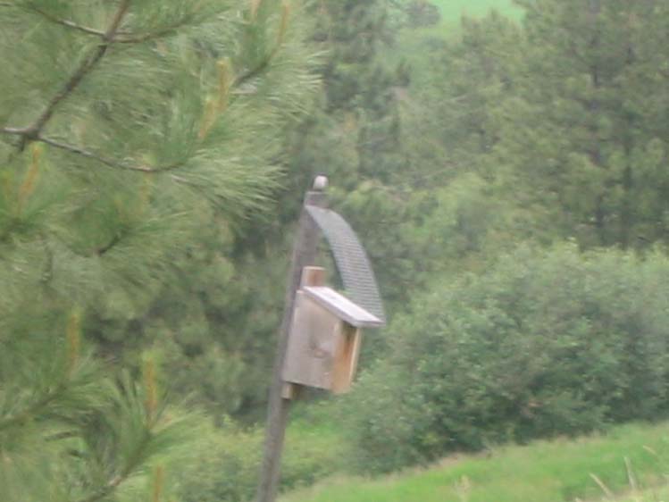 A bird nest box, a pole, a tree swallow atop. (blurry :(