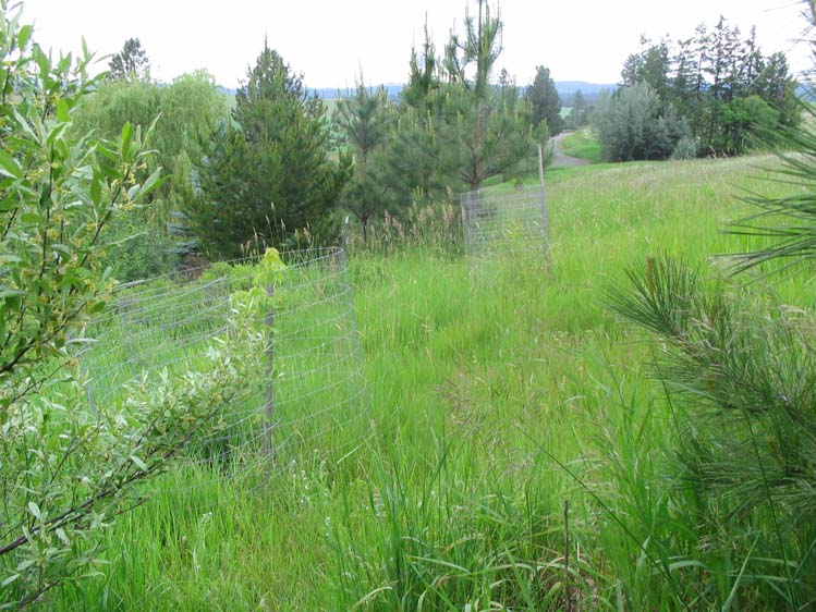 Still beside the field heading north. Wire cages to protect my fruit trees (and a maple) from deer.