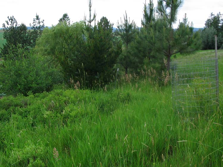 The wire cage around a peach tree. The young pine trees I planted 1997.