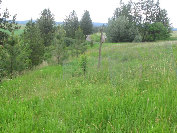 Facing North again, a young cherry tree inside the exclosure fence. The county road curves through the area.